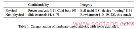 Table 1 categorizes hardware attacks. First, we distinguish between physical and non-physical attacks. Physical attacks require direct access to the system's hardware, such as detecting voltage levels or scraping silicon chips. Non-physical attacks exploit hardware without direct access, making them potentially more powerful. For example, timing bypass attacks can be executed remotely on cloud servers.