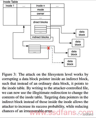 Second, the attacker needs to be able to identify if the damage was successful, i.e., the indirect block pointer points somewhere in the inode table instead of somewhere else. In fact, this is easy to implement due to the structure of the inode table (for example, the markup of a regular file with default permissions is repeated every 256 bytes).