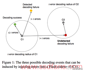 (3) No decoding failure is detected if the number of errors > t and the vector falls within the decoding radius of another codeword. In this case, corrupted data is returned as if the read was successful.